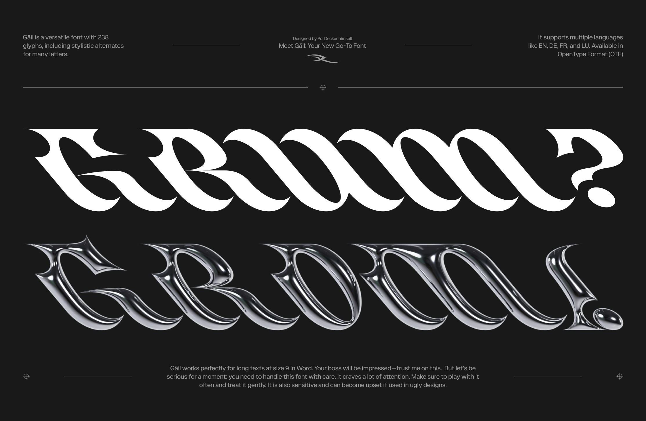 But let's be serious for a moment: you need to handle this font with care. It craves a lot of attention. Make sure to play with it often and treat it gently. It is also sensitive and can become upset if used in ugly designs.
